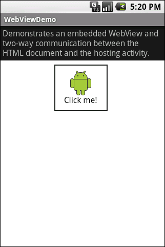 This could, of course, easily be accomplished with a little bit of JavaScript. Instead, though, WebViewDemo takes a slightly more complicated path to illustrate two very powerful features of WebView.