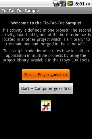 If you want to build the TicTacToeMain application, you can obtain it by downloading the "Samples for SDK API 8" component (or higher version) into your SDK, using the Android SDK and AVD Manager. Note that the application project depends on code and resources found in the TicTacToeLib library project — in order to build TicTacToeMain, you need to add both projects to your development environment.