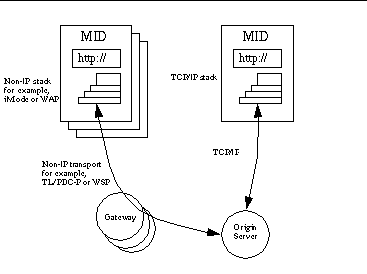 javax.microedition.io.HttpConnectionThe MIDP extends the connectivity support provided by the Connected, Limited Device Configuration (CLDC) with specific functionality for the GenericConnection framework. The MIDP supports a subset of the HTTP protocol, which can be implemented using both IP protocols such as TCP/IP and non-IP protocols such as WAP and i-Mode, utilizing a gateway to provide access to HTTP servers on the Internet.
